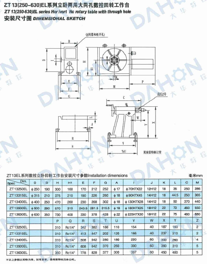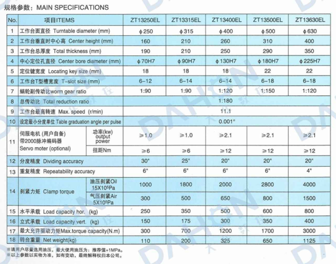 第四軸是各類(lèi)數(shù)控鏜、銑床和加工中心的關(guān)鍵配套附件,可以主軸垂直和水平兩種方式安裝在主機(jī)工作臺(tái)上,用作主機(jī)的第四回轉(zhuǎn)軸。轉(zhuǎn)臺(tái)在主機(jī)相關(guān)控制系統(tǒng)控制下, 可實(shí)現(xiàn)等分的和不等分的孔、槽或者連續(xù)特殊曲面的加工,且保證很高的加工精度。 ZT 13E series Hor /vert NC rotary table can carry out the performance of direct and indirect dividing plate proc essing, plateslotting and various cam-curving